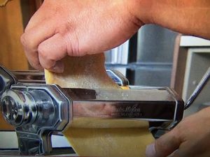 5mm厚さのローラーにかけてから、4mm幅のローラーにかけて麺状に伸ばす。