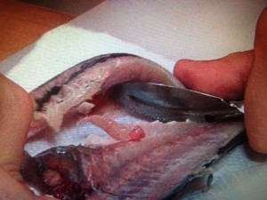 2、スプーンをホールドし、エラの下に入れ骨に沿って身をはがす。