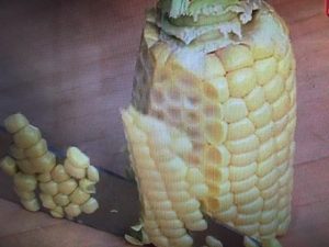 2、とうもろこしは長さを半分に切り、切り口を下にして立て、包丁で粒の根元を残してそぎとる。