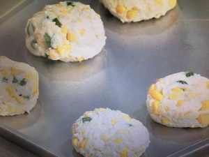 粒ごとはずすと揚げたときに破裂するので、とうもろこしは必ず粒の根元をそぎとっておく。