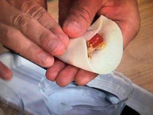 皮の縁に水を塗り、三角形に折って包んで口を閉じる。
