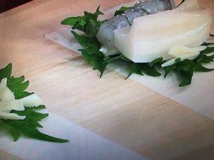 マヨネーズ少々を絞り出し、上に(1)のえび1切れとれんこん1本を並べる。