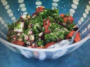 3、食べる直前に(2)にたことトマト、ピーマン、パセリを加え、塩・こしょう各適量で味を調える。