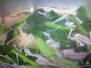 小松菜、えのき茸を加え、強めの中火にして1~2分煮て火を通す。