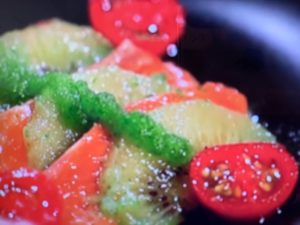 2、お皿にサーモン、キウイ、ミニトマトを並べて、すりおろしキウイフルーツをかける。