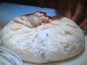 4、(3)の生地の中央に(1)のあんを丸ごとのせて、右手で3cm幅のひだを作っていき、左手で寄せる度にひだをギュッとつまみ、まな板を回転させながら一周してとじる。