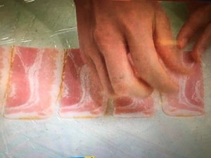 3、ラップを十字に重ねて広げ、ベーコンを並べる。