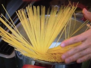3、(2)の鍋にパスタを直接入れて茹でる。