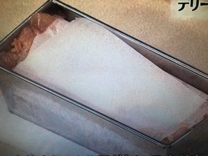 残りの(5)を入れて平らにならし、型から出ているオーブンシートを内側に折ってかぶせる。