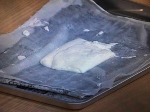 4、ペーパータオルの端を持ち上げ、折りたたむようにして、ヨーグルトを軽く押さえながら1か所へ寄せる。