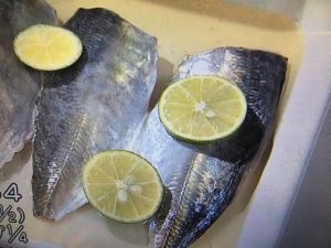 2、(1)を約10%の酢水でふり洗いして、塩を落とし、水気をきってバットに並べる。