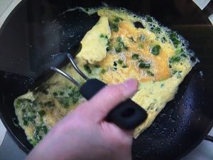 4、表面が半熟状になったら弱火にし、フライ返しで左右の端を折り、向こう側から手前に2回折って四角く焼き上げる。
