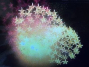 手前に出した指にピンとを合わせて花火のピントをボカせば、花火の形を変えることができます。